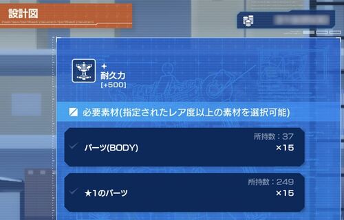 ブログ訪問ありがとうございます!新イベントを周回しつつ、新機能を確認中の「ガンダムブレイカーモバイル」です。今回のバージョンアップで実装された「ギア」の設計を試してみました。 「耐久力[+500]」のギアの設計図です。なんと吃驚! パーツ(B…