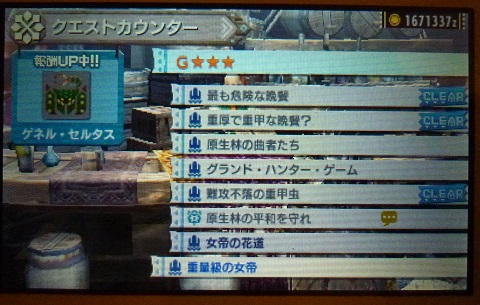 まずは「アトラル・カ」と思ったんですが、調査対象が「ゲネル・セルタス」になっていたので、集会酒場G★3『重量級の女帝』を受注しちゃいました