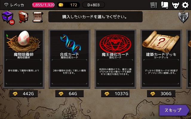 ゴールドが貯まると商人によって、「魔物培養卵」を買い、「魔王強化カード」で強化を行ってきましたが、803日目でとうとう金欠に・・・(^^;) 少しずつの値上がりでも、ちょっと価格が高くなりすぎ