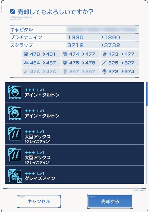 ★3パーツは1個売却でプラチナコイン3枚入手できますから、最低でも、本体の5種×4パーツ=20パーツ×3枚=60個枚のプラチナコインを毎週入手できるので、4週間で240枚獲得できますね(今までこれを見逃していたとは・・・・)